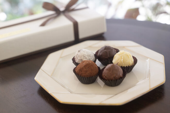 大人向けのプレゼントなら、フランス産クーベルチュールチョコレートを使用した5種のトリュフチョコレートも。ジャマイカラムやコアントロー、ブランデーなどの洋酒をふんだんに使用したガナッシュに、ダークやミルク、ホワイトチョコなどをコーティング。5種類5個入り2214円、10個入り4212円。