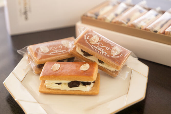 この店の看板商品は、自身の名を冠した「中嶋さんのレーズンサブレ」。牛乳を加えた卵黄を表面に何度も塗って焼き上げた、ツヤツヤと美しい上品な姿が印象的なサブレ生地に、バタークリームをたっぷりとサンド。レーズンは50度のラム酒に1カ月漬け込み、とろけるような舌触りで、バタークリームによく馴染むように仕上げられている。サブレ生地、クリームで使用するバターは発酵バター100%。口に含むと発酵バターとラムレーズンの芳醇な香りが豊かに広がるぜいたくな味わいだ。おいしいものをよく知る著名人たちも、これを求めてふらりと訪れるという。