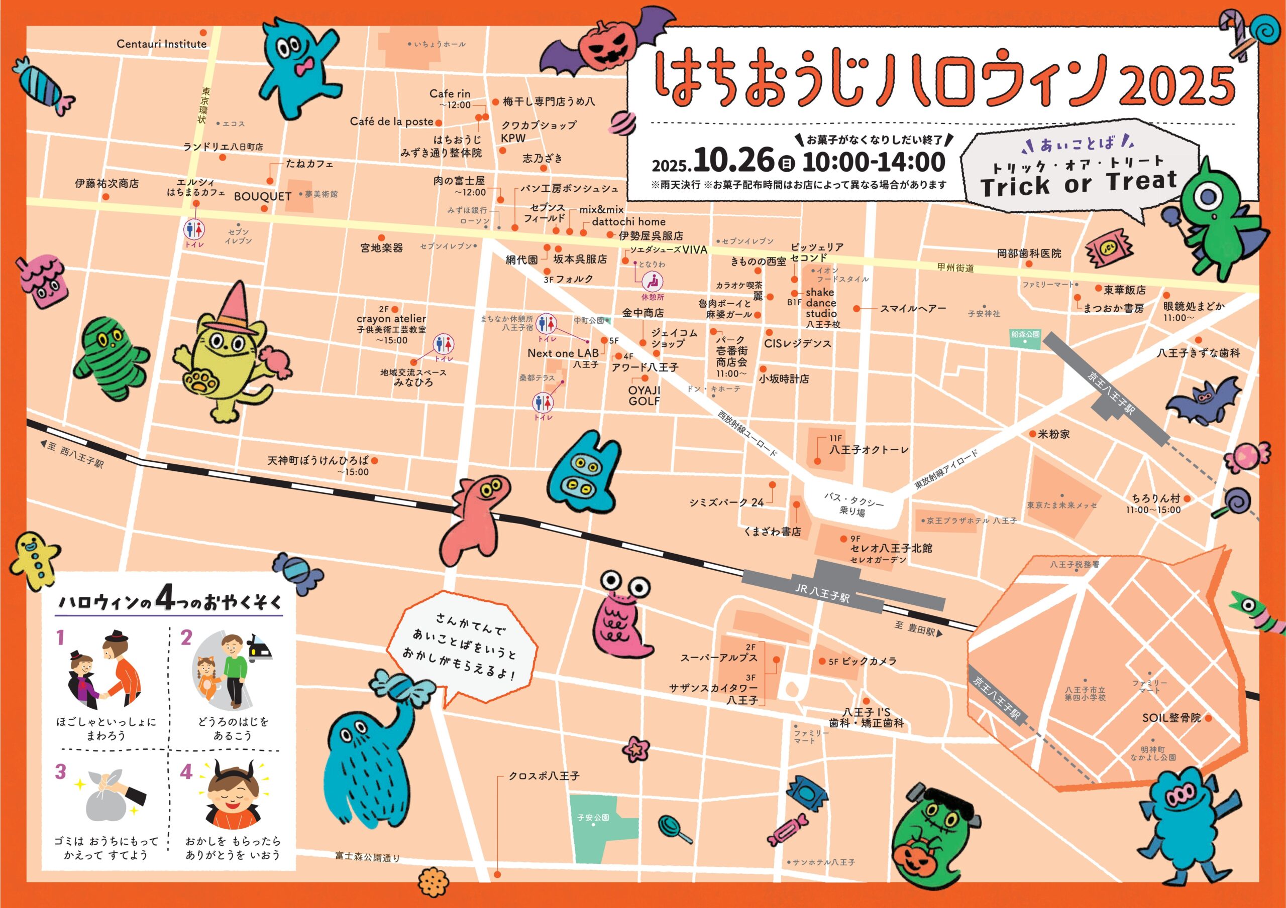 「親子でまち巡りを楽しみ、まちやお店を知ってもらう日」として開催される本イベントでは、八王子駅周辺の多数の店舗が参加し、「トリックオアトリート!」を合言葉に店を訪れた子供たちへお菓子を配ります。