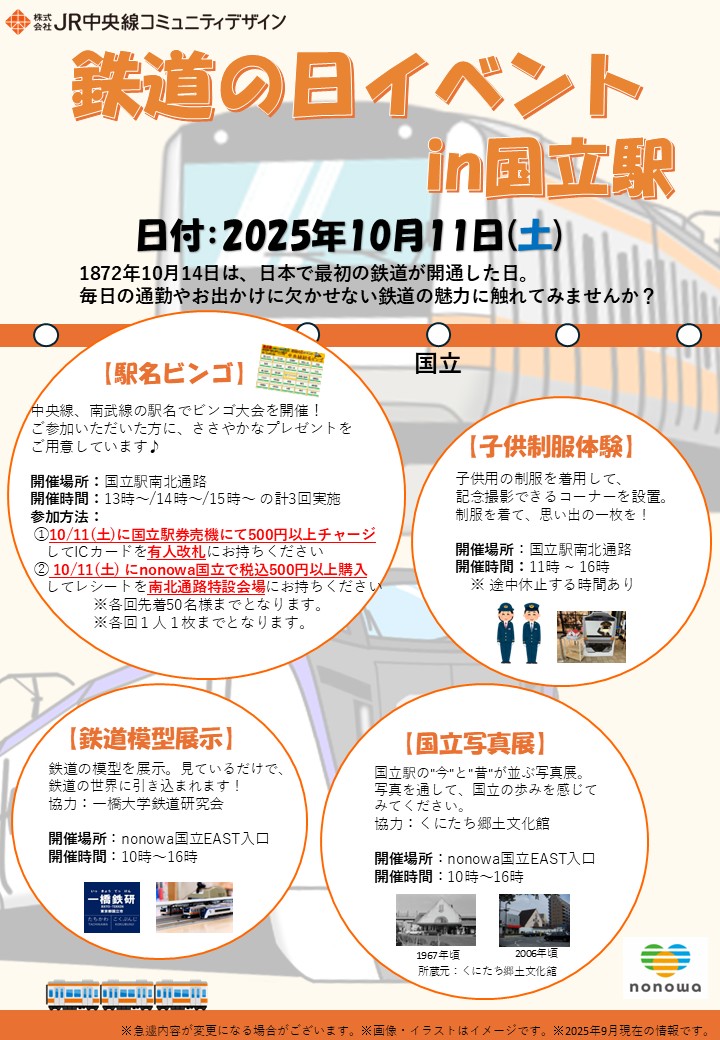 2025年10月11日(土)に、国立駅南北通路、nonowa国立EAST入口にて「鉄道の日イベントin国立駅」が開催されます。
