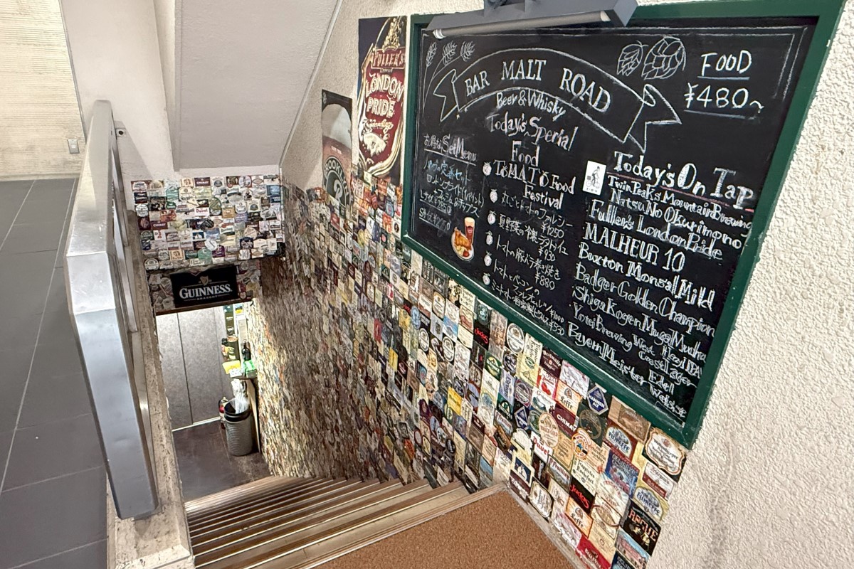 階段の壁は、海外ビールのラベルで埋め尽くされている。ビール好きなら店内にたどり着くまでに、この階段で心が奪われてしまう。