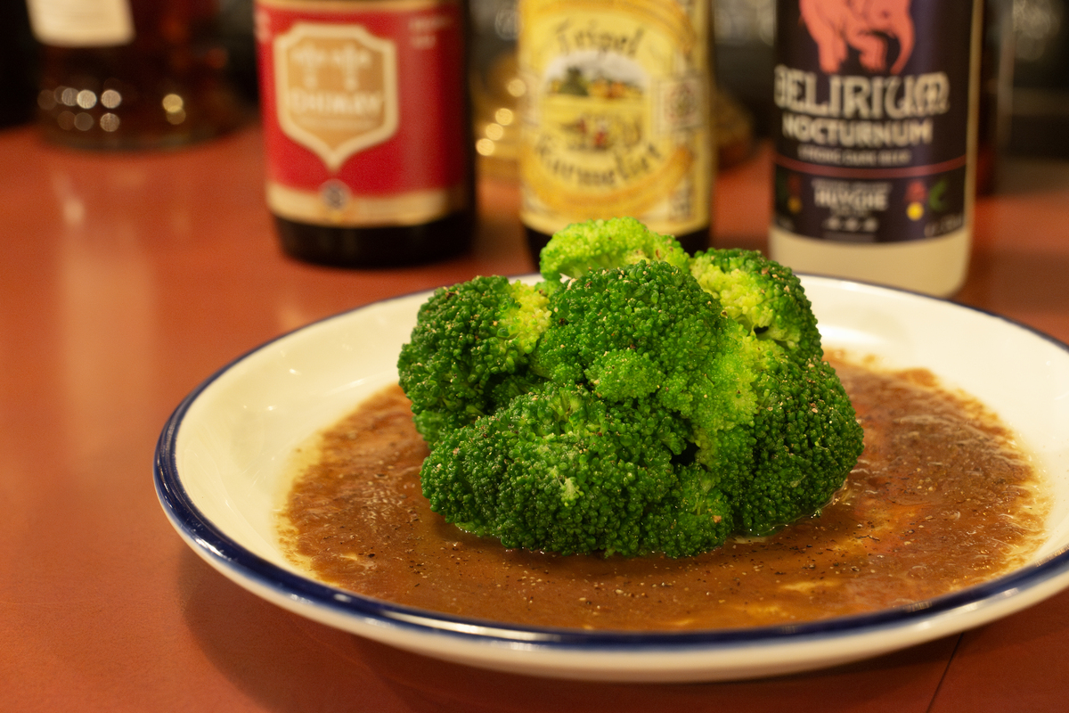メニューを見ると、ビールにあいそうな料理が並んでいる。サラダがわりにオーダーしたのは「森森ブロッコリー」680円。その名の通り、山盛りのブロッコリーをアンチョビガーリックのソースで味わうシンプルな料理だが、これが見事ビールにマッチ!