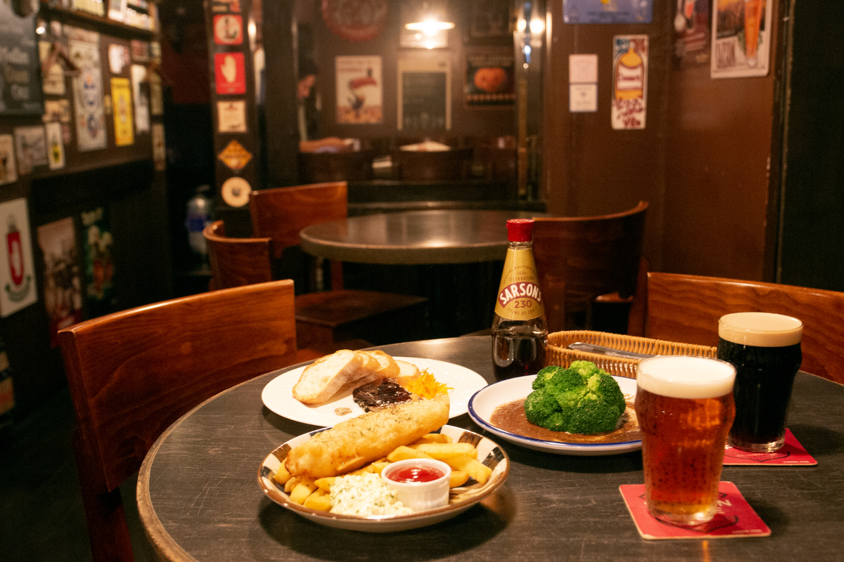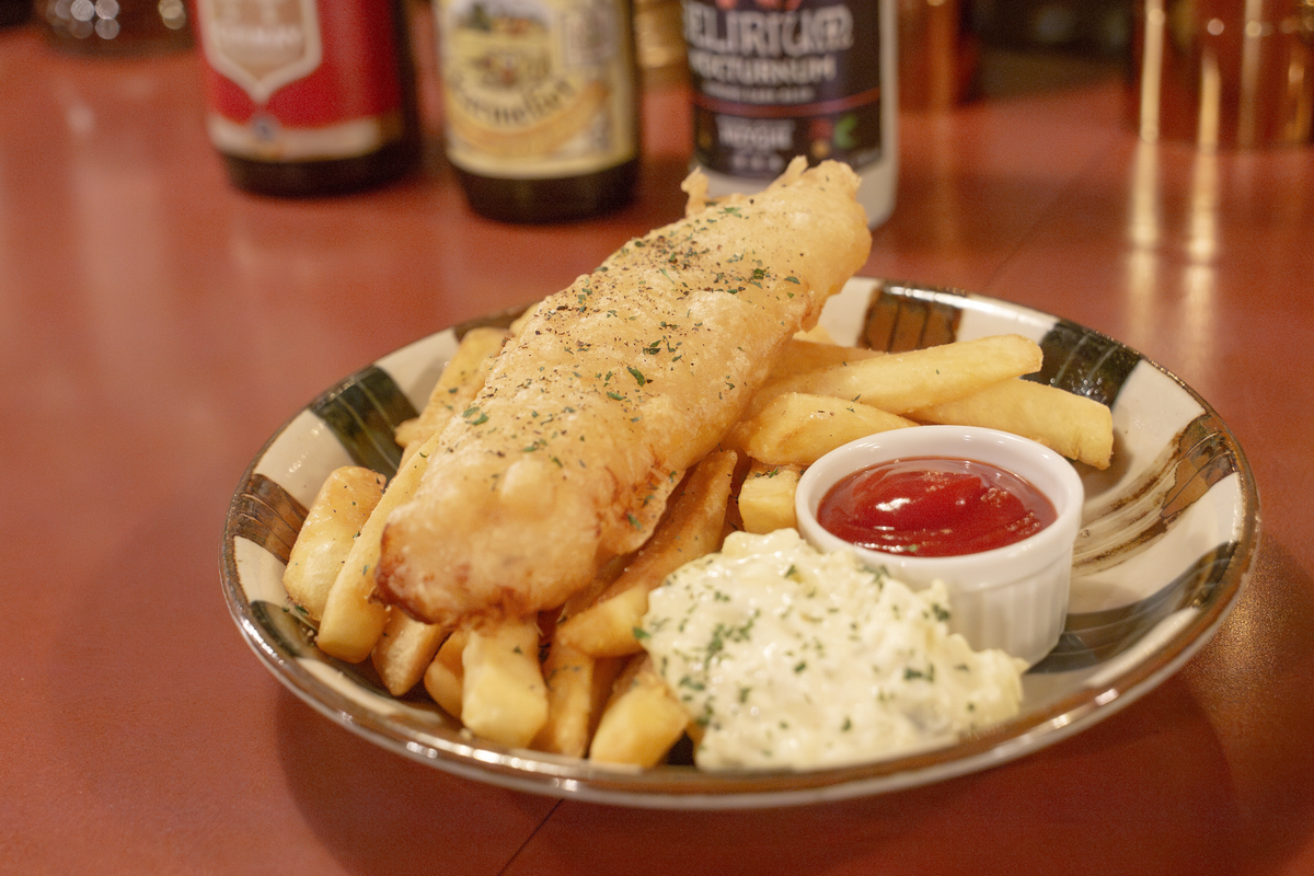 そしてパブといえば、やっぱり外せないのはフィッシュ&チップス。Sサイズ950円が用意されているのがおひとりさまにもうれしい。ビールを加えた衣でパリッと揚げた真ダラと、太めにカットされたポテト。これを自家製タルタルソースにディップしながらビールと一緒に楽しむことこそが、まさにパブの醍醐味だ。