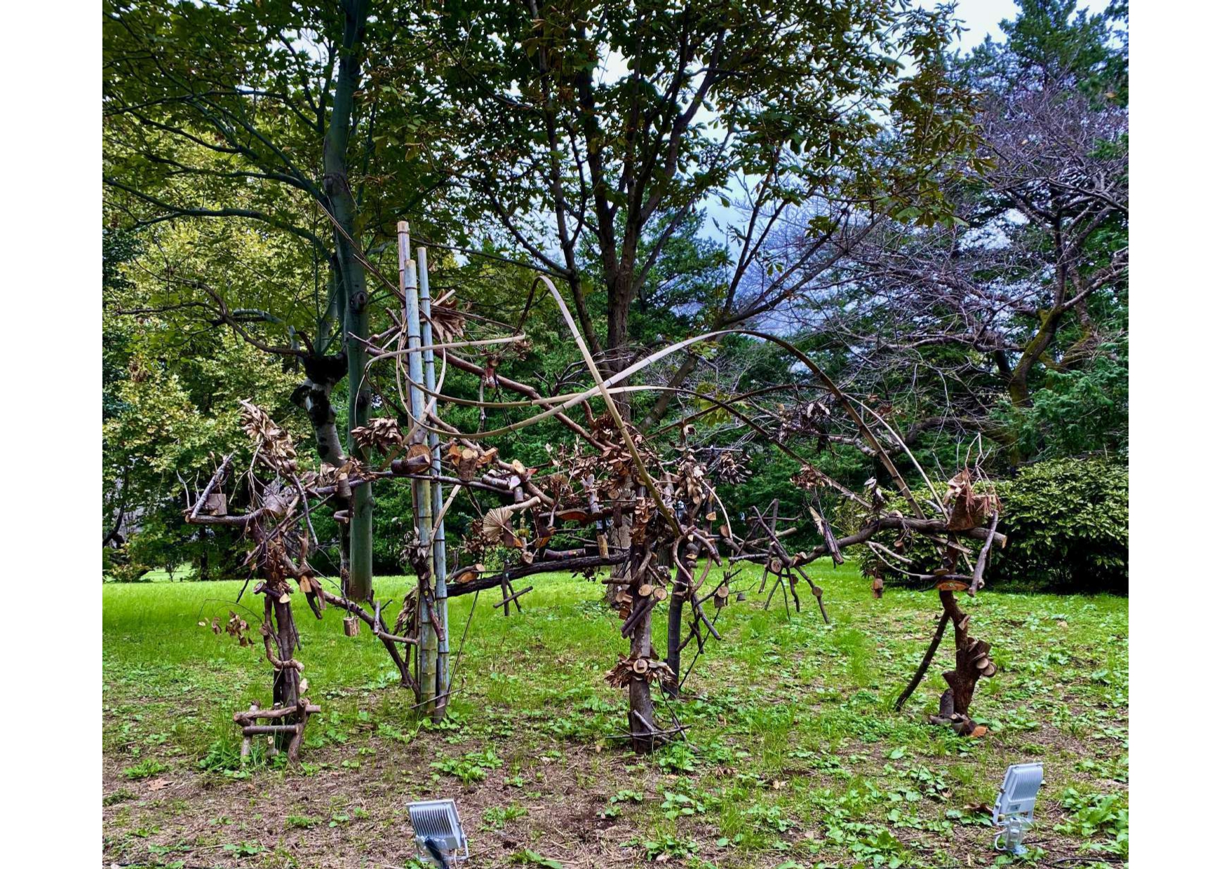 園内で剪定された樹木や間引いた竹、台風などにより倒木した木をチップにして土に還す前に、もう一度造形作品として甦らせたい!という思いのもと制作する「人と樹々とのセッション・エコアート」です。