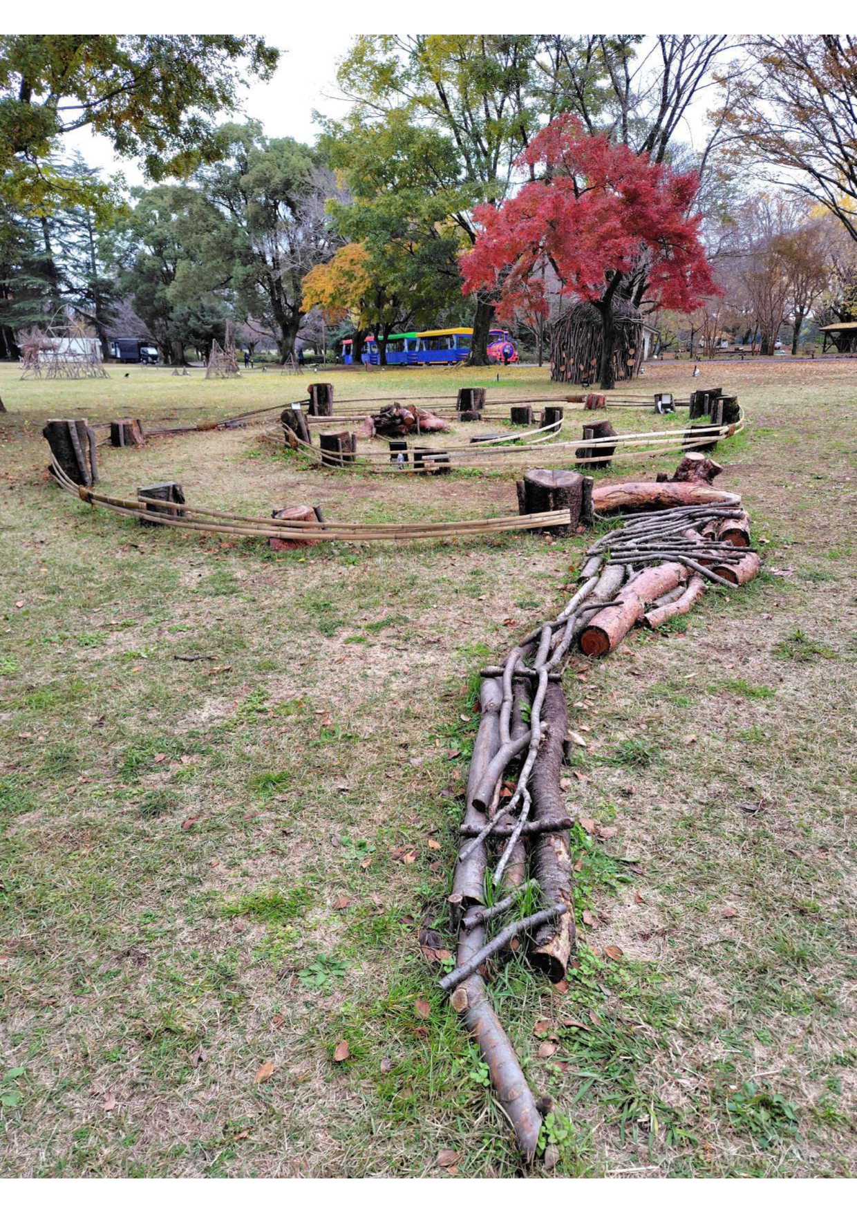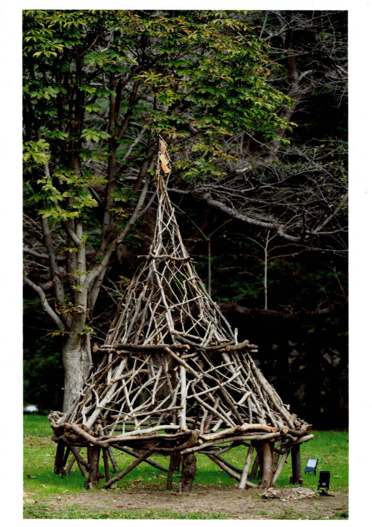 園内で剪定された樹木や間引いた竹、台風などにより倒木した木をチップにして土に還す前に、もう一度造形作品として甦らせたい!という思いのもと制作する「人と樹々とのセッション・エコアート」です。