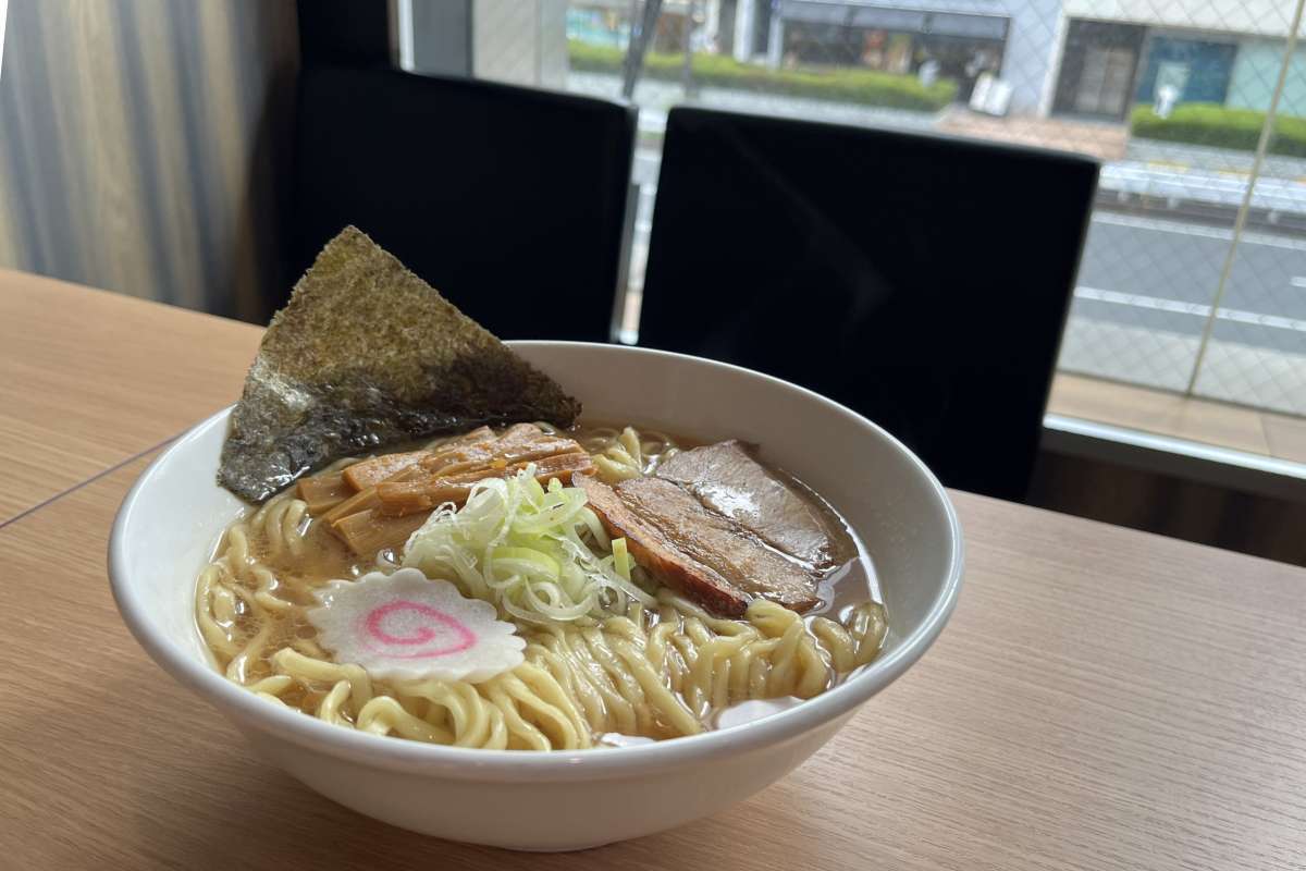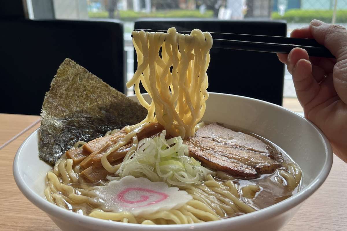 看板メニューの「ラーメン」750円は、サバ、イワシ、カツオなどの「節」に「豚ゲンコツ」、「鶏モミジ」と「牛骨」を合わせた“クアトロスープ”。ひと口目に魚の香りが立ち、後味はバランスよくまとまる奥行きある味わいだ。これに合わせるのは、店内の製麺室で毎朝仕込む自家製の平打ちちぢれ麺。高級小麦「特ナンバーワン」と群馬産鶏卵を使用し、もちもち食感でツルリとした喉越し。