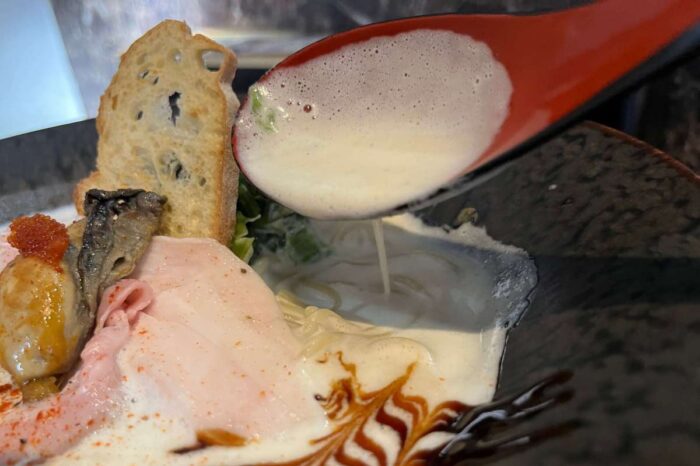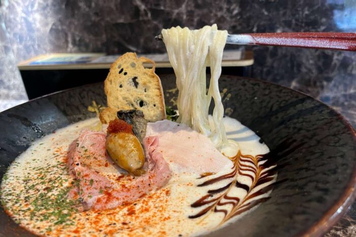 ラーメンに、本格フレンチのエッセンスを織り交ぜて提供するのは、JR中野駅北口から徒歩5分のところにある『ただいま、変身中。』だ。駅前から続く繁華街には人気店が連なり、都内屈指のラーメン激戦区のなかでもひときわ異彩を放っている。看板メニューの「牡蠣豆乳」930円は、牡蠣と鯛からとった出汁に豆乳を合わせ、ブレンダーで泡立てたスープが特徴。滋味深く、実にまろやかで、コクがあるのに後味はあっさりといただける。ほか、月イチ替わりの限定商品も登場するので何が出るかは訪れてからのお楽しみ。