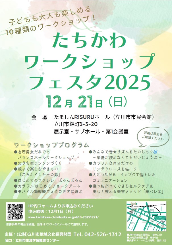 2025年12月21日(日)、立川駅から徒歩13分の場所に位置するたましんRISURUホールにて「たちかわワークショップフェスタ2025」が開催されます。