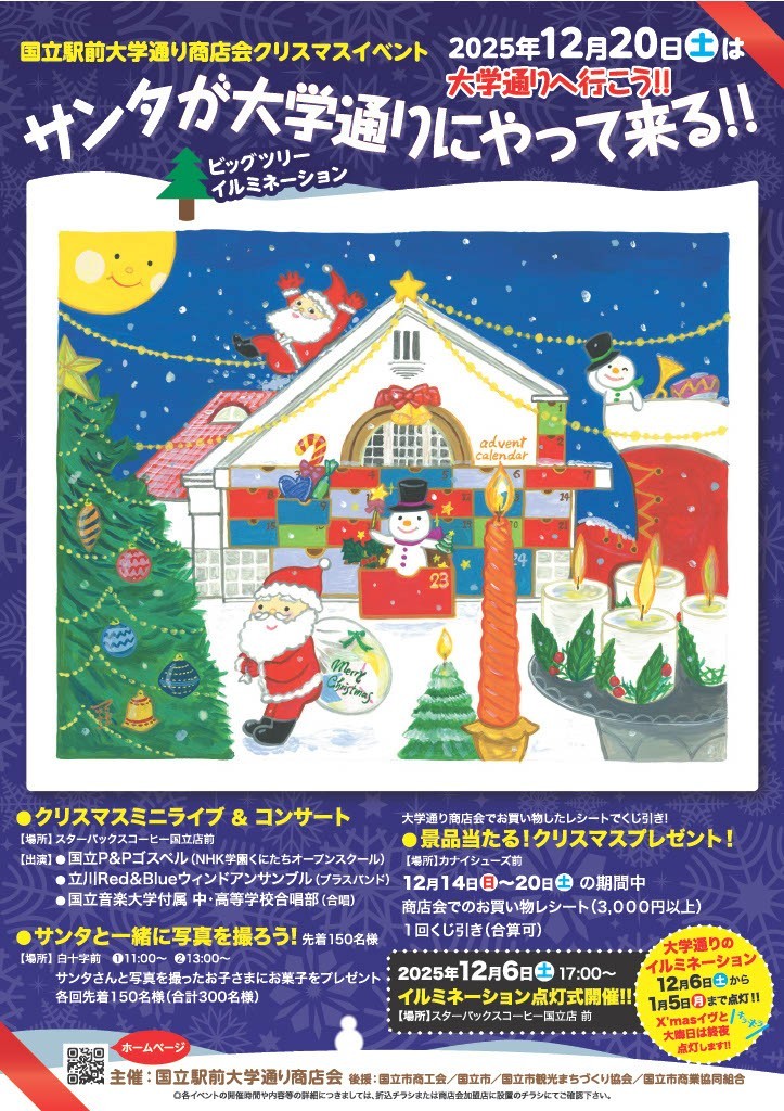 国立駅前大学通り商店会では2025年12月6日(土)~2026年1月5日(月)までイルミネーションの点灯を実施。その期間のメインイベントとして、12月20日(土)に開催されるのが「クリスマスイベント2025」です。