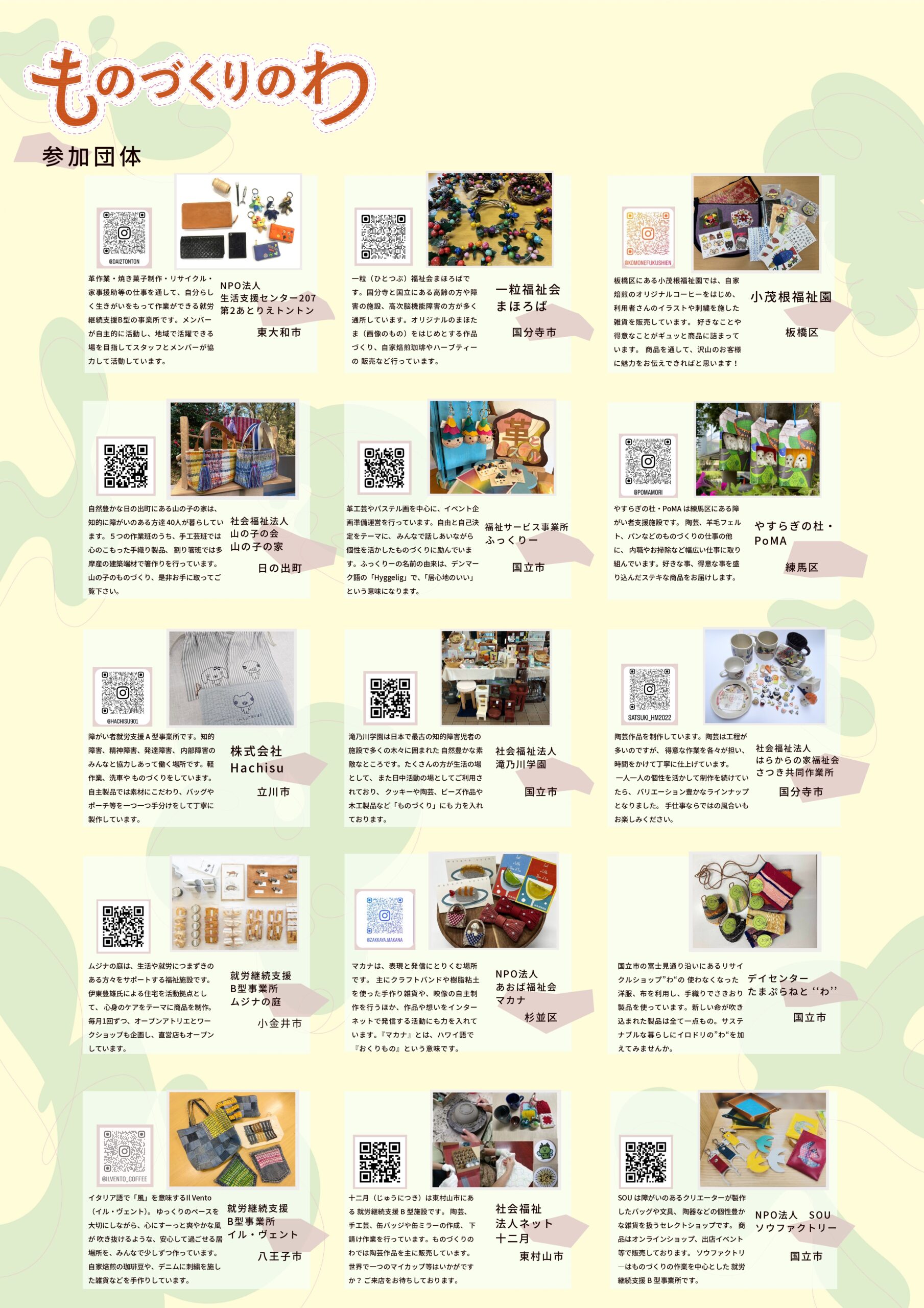 普段何気なく使っているものも、誰かの手仕事によってできていて、私たちの生活に繋がり日常を豊かにしてくれます。「ものづくりのわ」は、そんな輪を国立で広げていくイベントです。