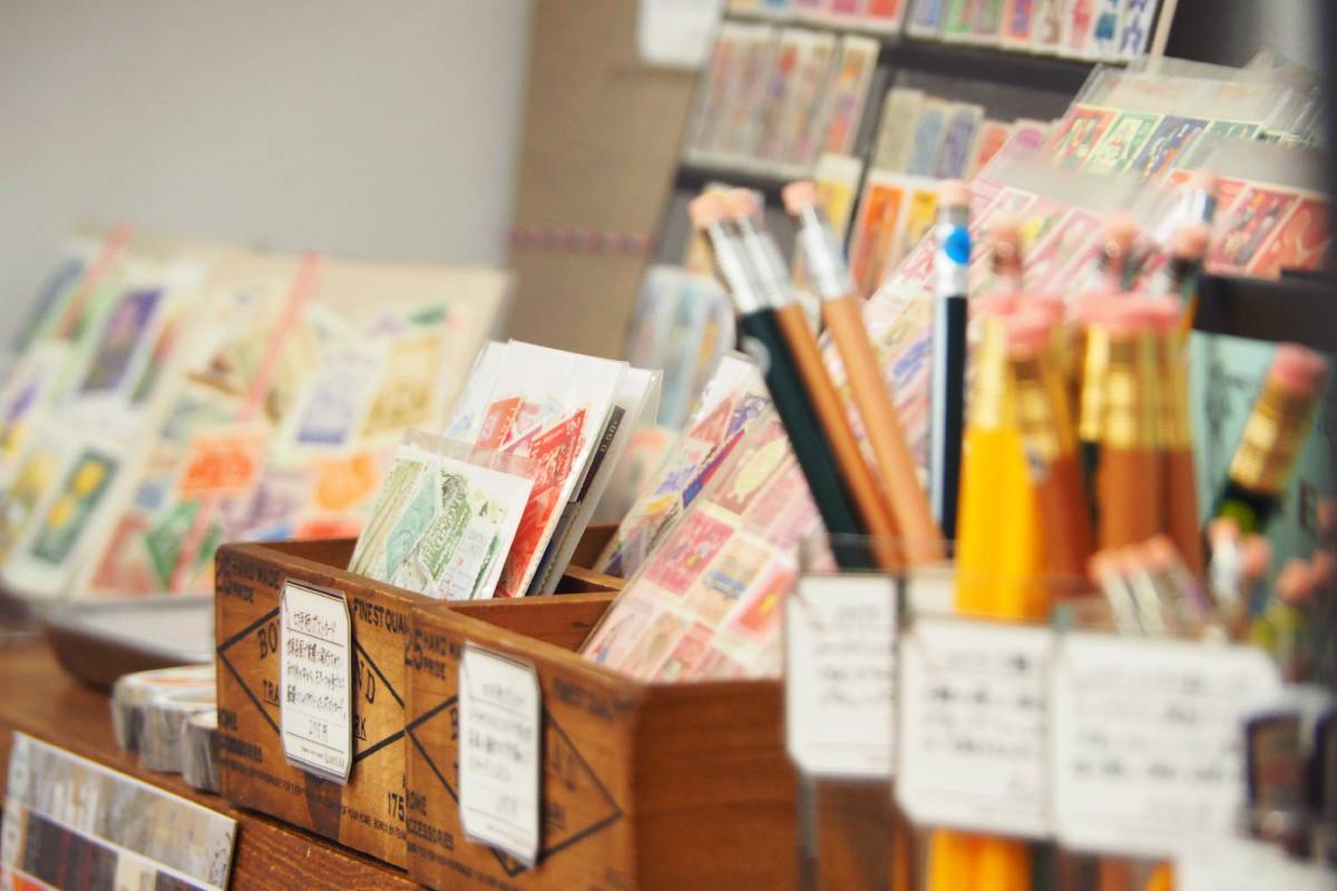 「文具に限らず、この店らしいなと思うものを選んでいます」と山田さん。イチオシは、老舗出版社・野ばら社のレトロなデザインが印象的な図案ハンコやシール。本を開いたまま置いておける文鎮などの読書グッズも人気だ。