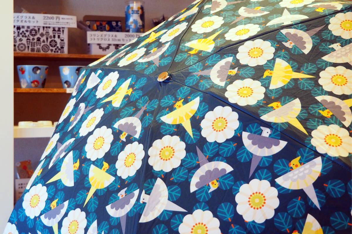 オカメインコと花が舞う新商品の傘3630円(予価)は、晴雨兼用で雨の日も猛暑の日も軽やかな気分になれそう。