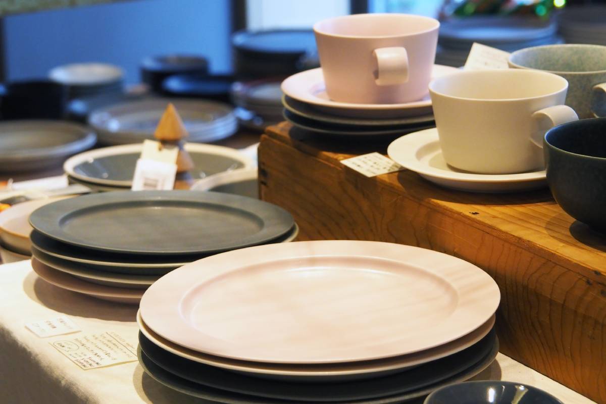 美濃焼の17ⅽⅿ皿1650円。波佐見焼のポットや有田焼の箸置きも人気。