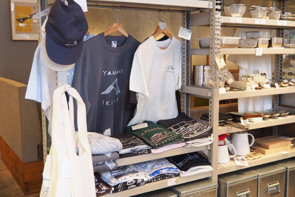 店内は、カフェと雑貨、ギャラリーが心地よく混ざり合う空間。一角に並ぶ生活雑貨や文具は、物にあふれている世の中であえて「これがいい」と思える確かさと遊び心を軸にしたセレクト。エコバッグやTシャツなど、オリジナルデザインのグッズも人気だ。