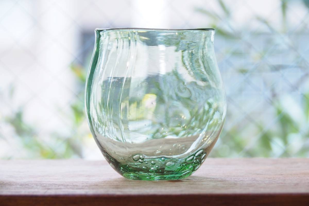 「glass imeca(グラスイメカ)」のグラス3850円。琵琶湖の水草で着色したガラスのゆらぎは湖を思い起こさせる。
