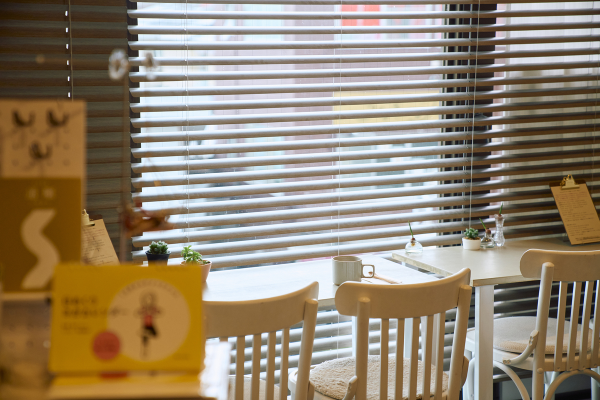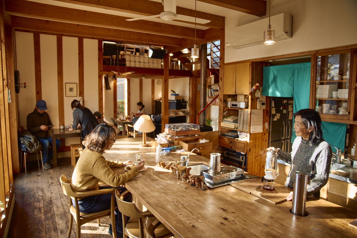 自宅1階を改装したカフェを、2007年より営むのは本橋徳枝さんだ。南向き一面の大きな窓に等間隔でヒノキの柱が並び、その隙間から陽光が木漏れ日のように店内に落ちる。
