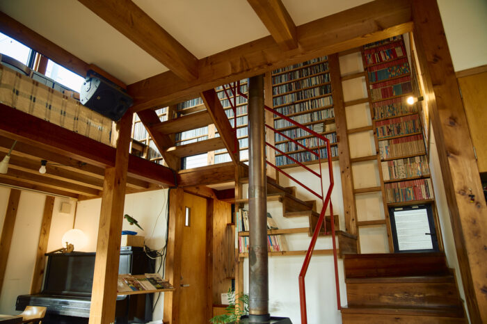 2階へ誘う階段の壁には「夫のコレクション」というジャズのCDやレコードがぎっしり。1階の棚に本も置かれ、手にとってページをめくるのもいい。