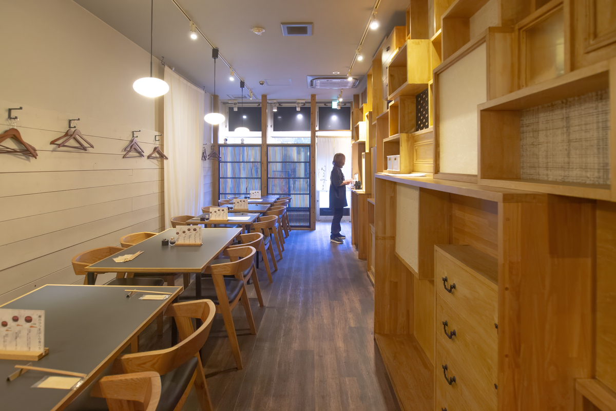 店内に入るとふわりと漂う香ばしさに包まれる。二人掛けテーブルを合わせた座席がいくつも並んだシンプルな構成で、これならおひとり様でも気兼ねなく食事ができそうだ。