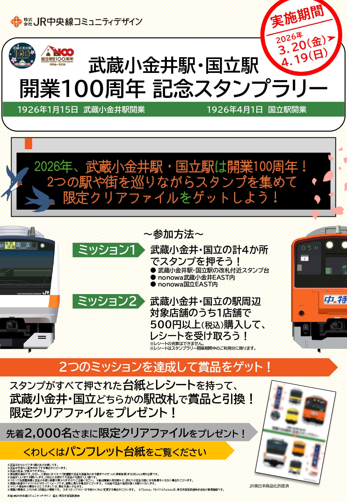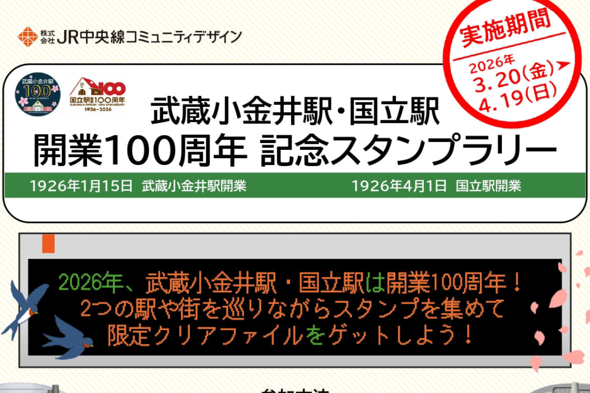 2026年3月20日(金・祝)から4月19日(日)までの期間、武蔵小金井駅・国立駅及び近隣店舗で「武蔵小金井駅・国立駅 開業100周年記念スタンプラリー」を開催します。