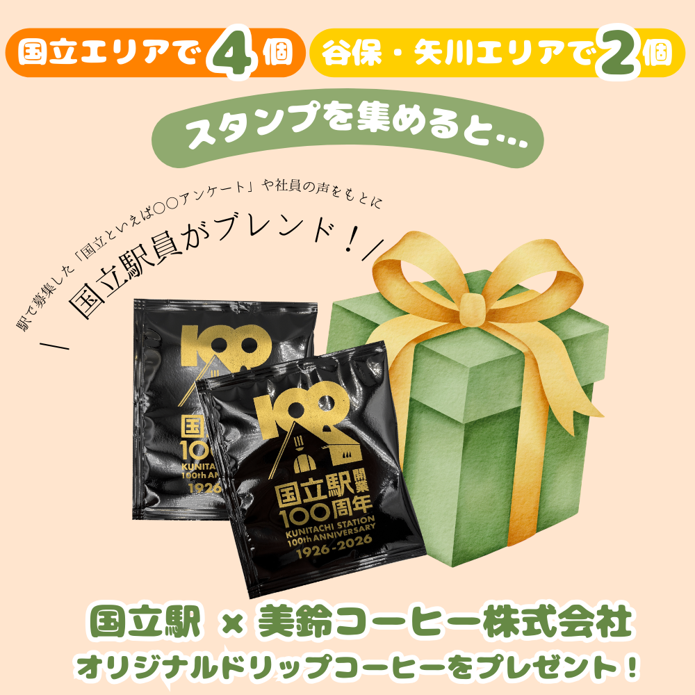 周辺の魅力的な国立エリアの4箇所と、谷保・矢川エリアの2箇所のスポットを巡り、スタンプを集めると「国立駅員ブレンドの100周年記念ラベルオリジナルドリップコーヒー」をプレゼント。