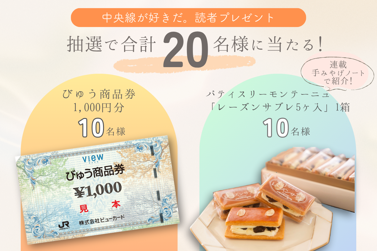 「びゅう商品券(1000円分)」または、連載「中央線手みやげノート」に掲載した『パティスリーモンテーニュ』の「レーズンサブレ 5ケ入り」を抽選で合計20名様にプレゼント。